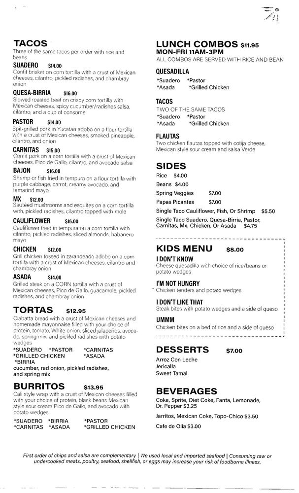 Chicken or suadero rolled in fried corn tortillas, topped with fresh salsa Verde, cotija cheese, sour cream, cilantro, onions, and pickled radish.
